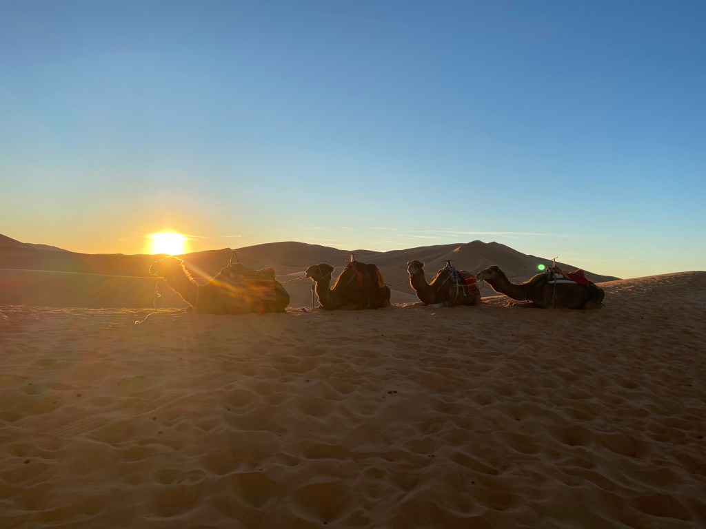 Next morning, we started around 7 and reached the grand canyon, which I found unexpectedly beautiful. We took pictures, heard stories from our guide, and visited a Berber village to see some handmade crafts. Then we traveled a long way to Merzouga, the start of the Sahara desert. I was excited for the camel safari, which turned out to be a 2-hour overwhelming experience ending at our tent. I made friends with people from Europe, Asia, and America, and we had a memorable bonfire night with singing, dancing, and traditional Moroccan music. The desert was very cold at night and hot during the day.